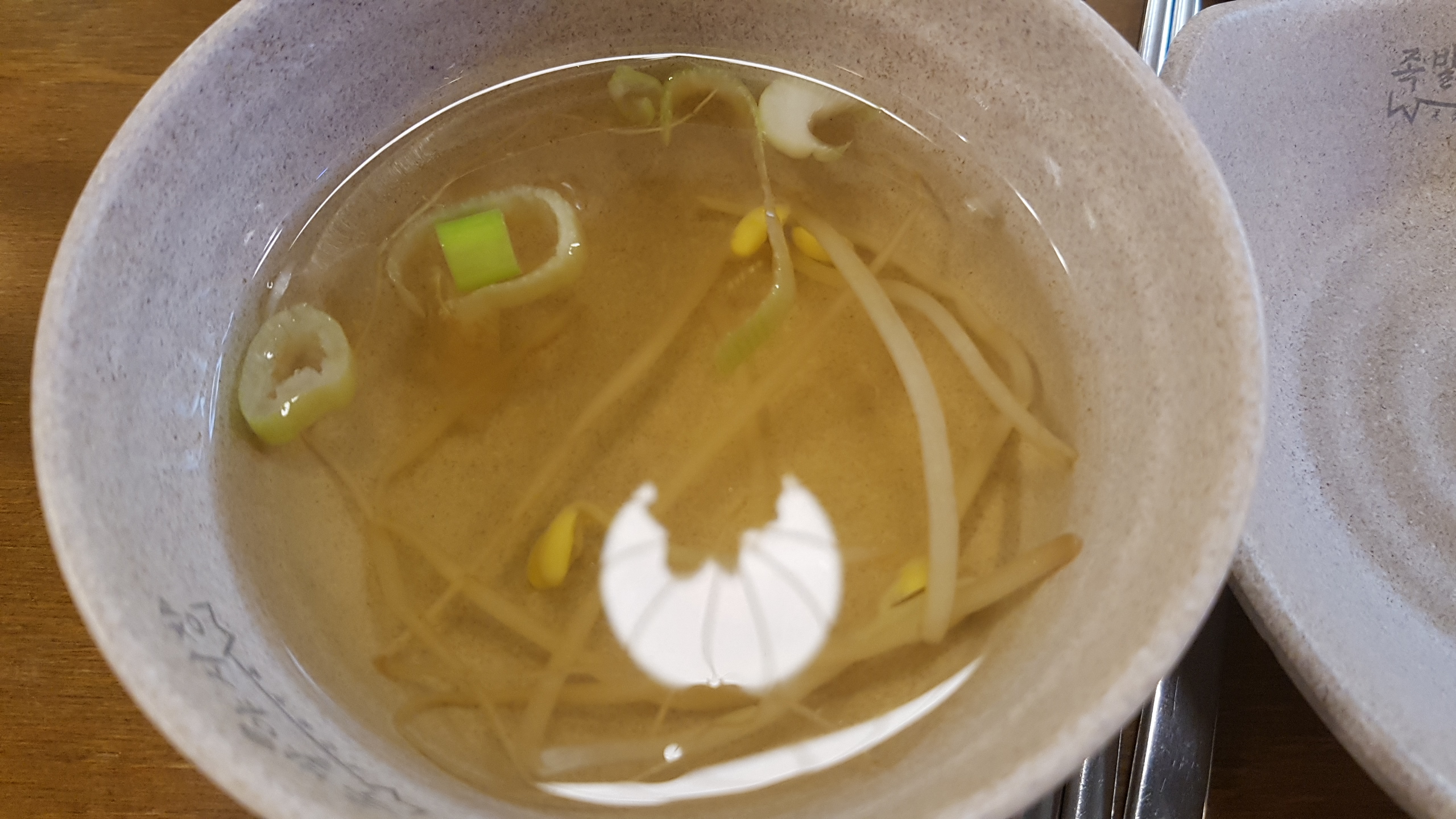 족발과 함께 곁들여 먹을수 있는 채소들과 함께 콩나물국이 제공되는데 얼큰하게 제공되어 술의 맛을 더해준다.