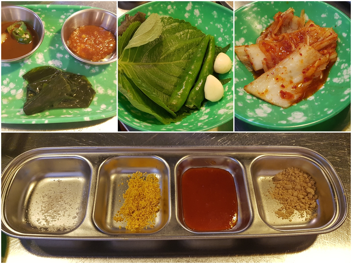 인계동 껍데기에 입장하면 자리에 세팅되어 있는 소스와 밑반찬들이다.