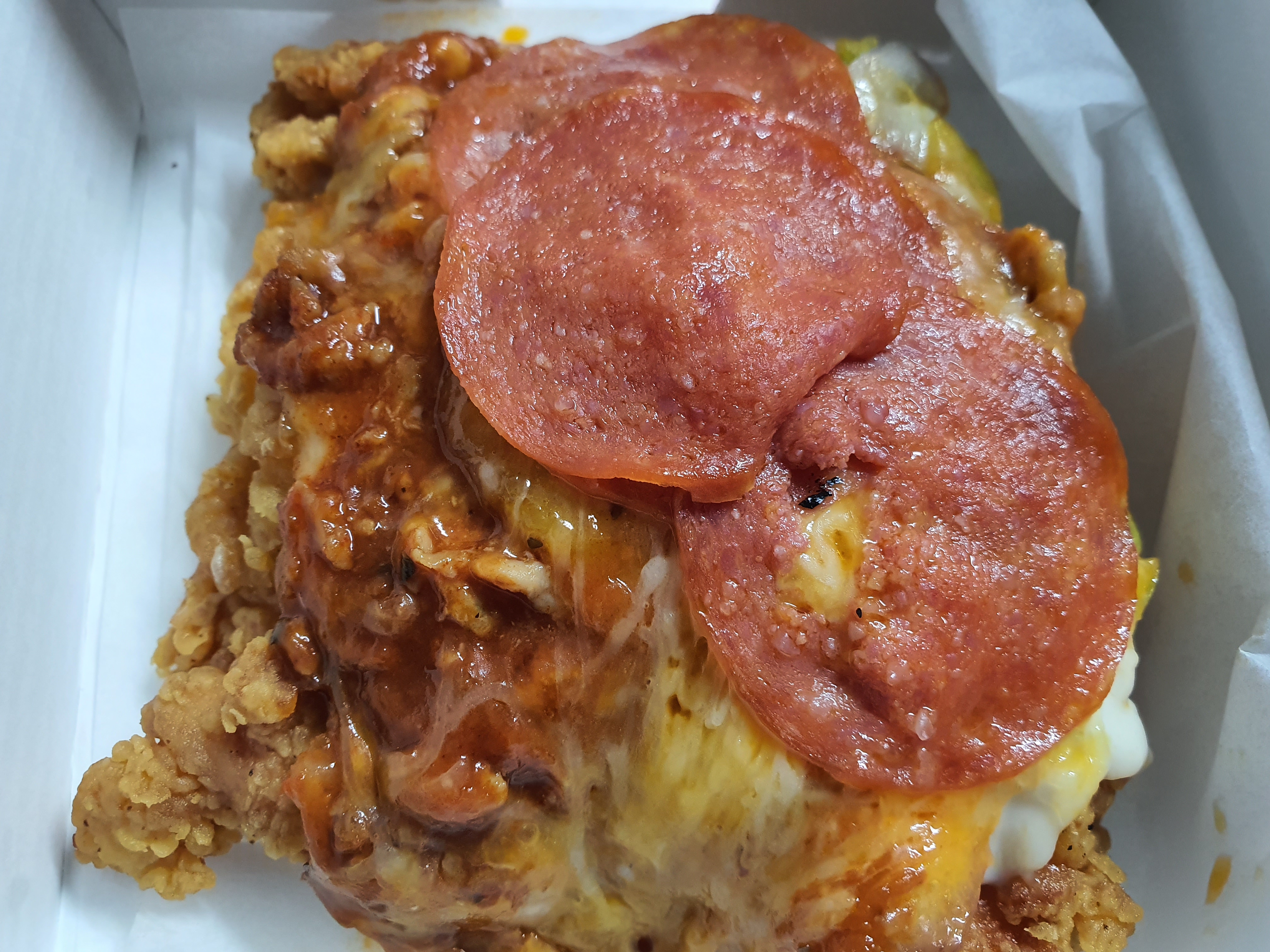 닭가슴살이이 튀김옷을 입고 넓은 순살치킨이 되었으며, 피자를 덮고 페퍼로니를 토핑한 모습이였다.