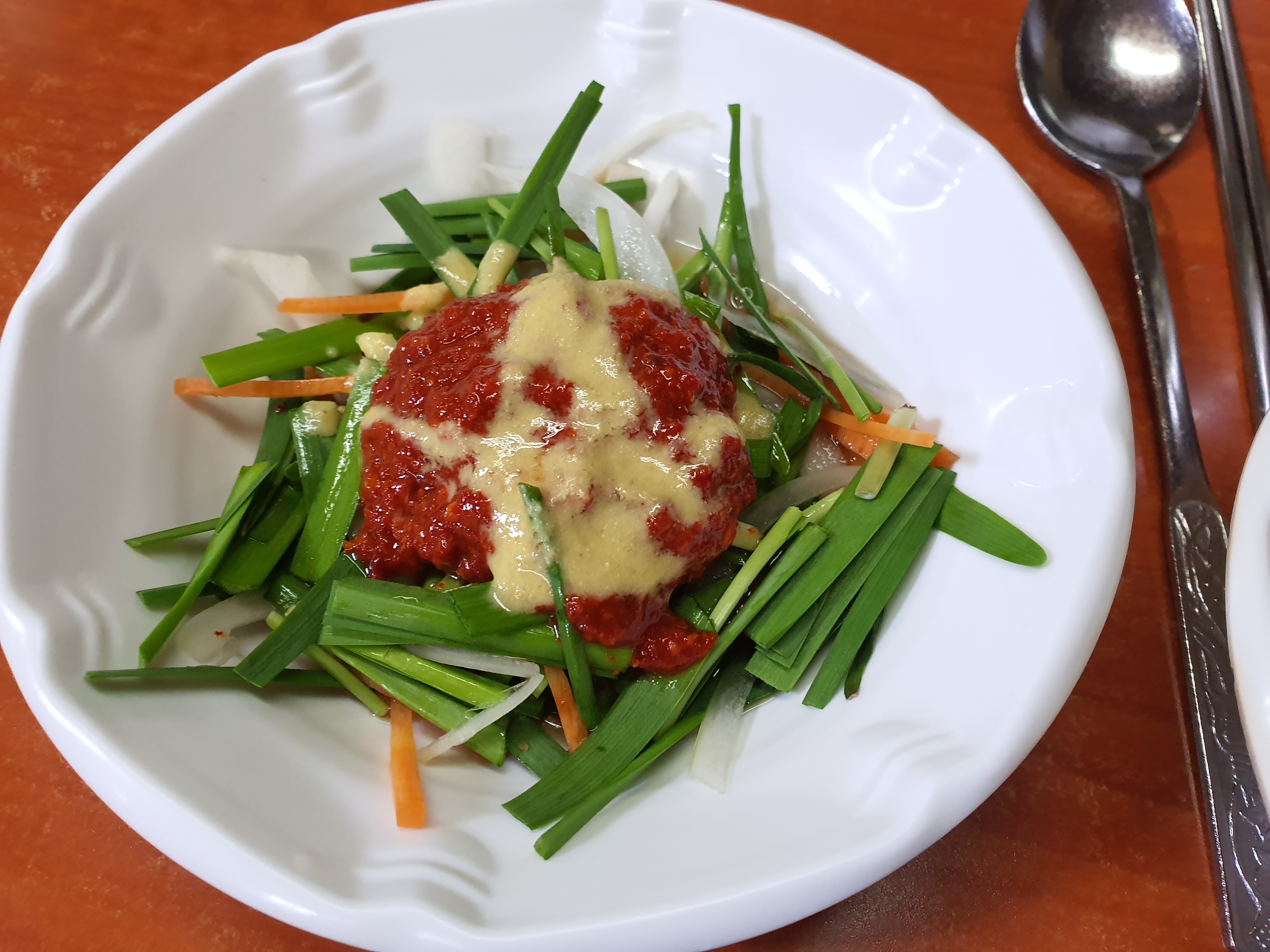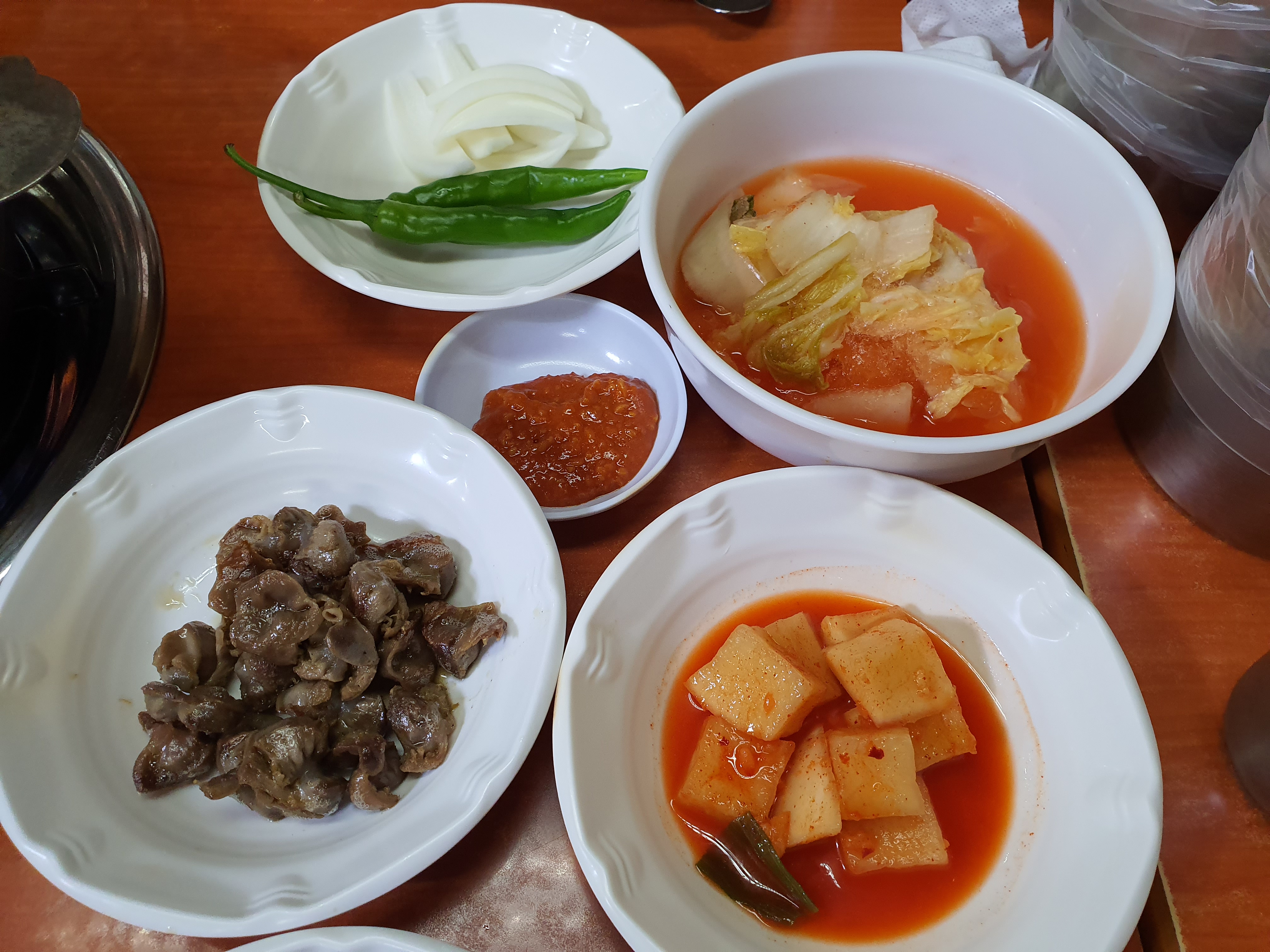 소스가 나온 후 닭똥집을 비롯하여 물김치, 깍두기, 양파와 고추가 나왔다.